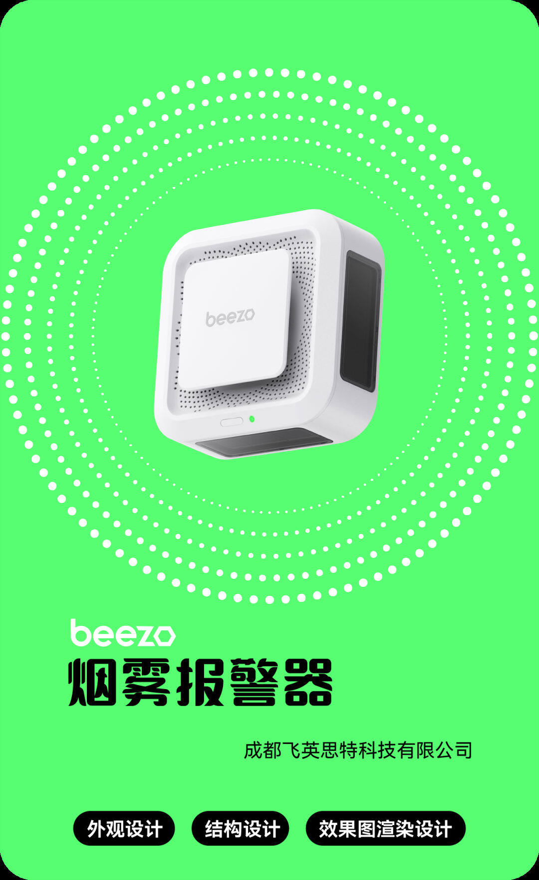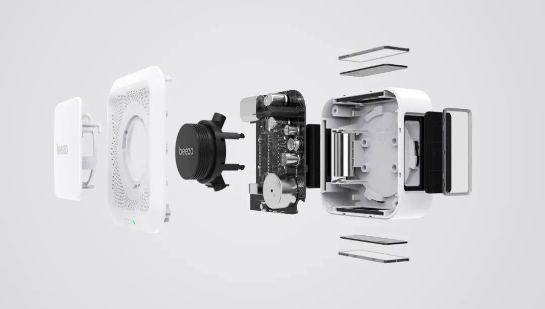 在老年人的生活空间中,安全一定是放于首位的。产品采用3M胶粘贴和螺钉两种安装方式,3M粘贴方便老人安装,螺钉安装可以使产品安装更为稳固。产品设计上,大面积的进烟孔直径仅为毫米大小,有效防止蚊虫误入影响监测灵敏度。机身外壳采用PC+ABS材料,耐高温抗冲击。确保了产品在恶劣环境下也能正常使用。