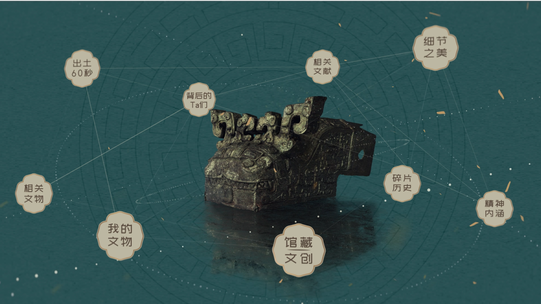 整体设计以青铜器的背景基调展开搭建,板式简洁,着重体现民族文化,突出博物馆的历史感和文化感。纹理上,使用代表青铜文化的蟠螭纹和象征“窗口”的中式花窗元素;颜色上,选取黛绿,赭石,灰汁,青白橡,赤铜等古典色搭配,使整体UI色调协调,具有空间感和层次,为用户了解大运河的历史文物提供了良好的交互体验。