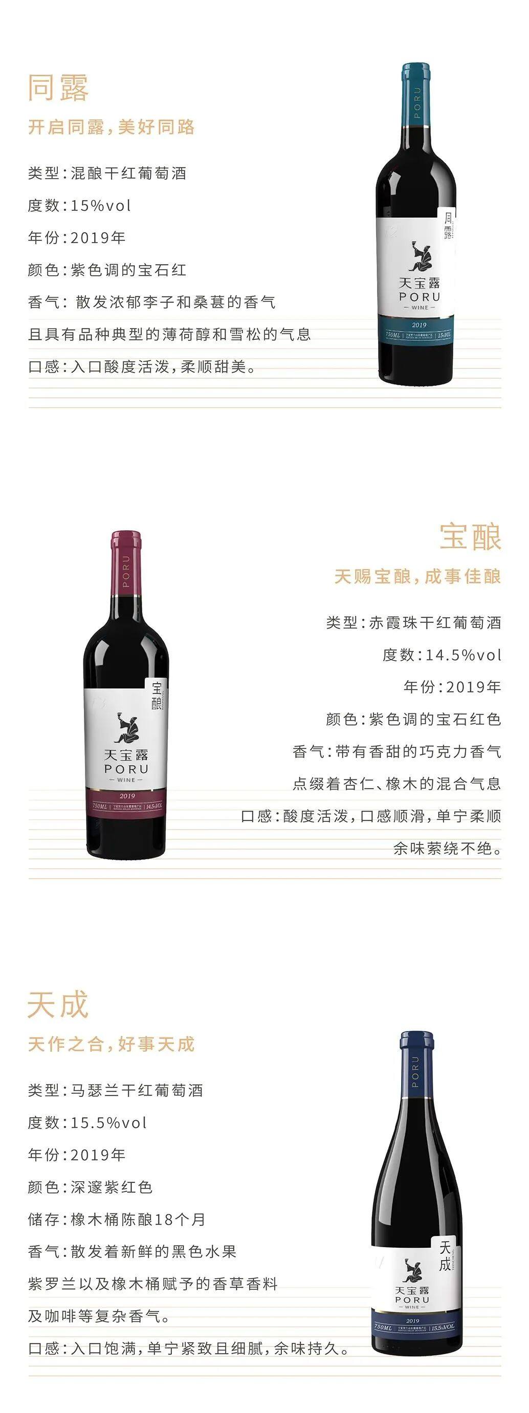 产品方面,天宝露首批上市的“T”系列产品共有三款产品,从“天宝露”品牌中各取一字,以“成事”为主题,分别命名为“同露”、“宝酿”和“天成”,三个系列对应从入门到热爱的不同用户需求,从品牌规划上让红酒更纯粹简单。葡萄酒不只是酒精饮料,它可以是一种生活、一种态度、一种艺术,一种自己的风格,一种让人自在的力量。忙碌的生活间隙,天宝露希望能让消费者获得美的享受,在品鉴和饮用的过程中得到情感共鸣,帮助消费者和自己对话。