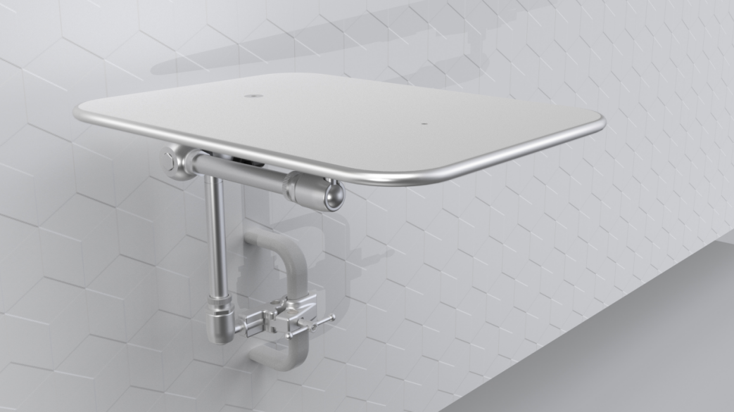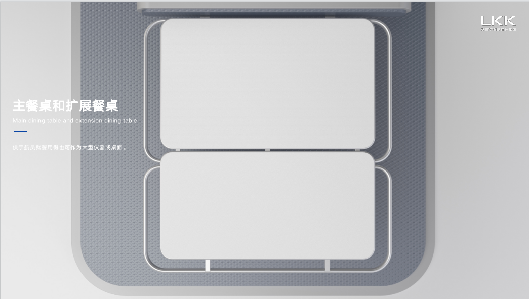供宇航员就餐用,也可作为大型仪器或桌面,主餐桌和扩展餐桌两部分可快速拆分组合不用借助其他工具,不用的时候可以折叠贴靠在舱壁上,不占用空间。