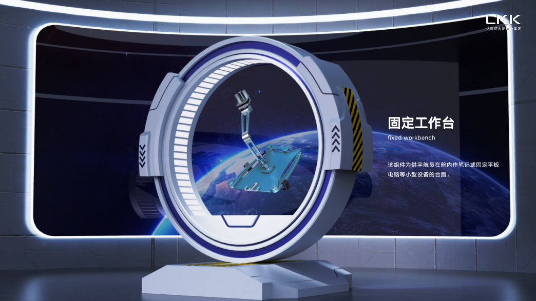 固定工作台用于宇航员在舱内做笔记,或固定平板电脑等小型设备台面,可以方便快速固定限位调节,不用时可折叠,重量轻、占空间较少。