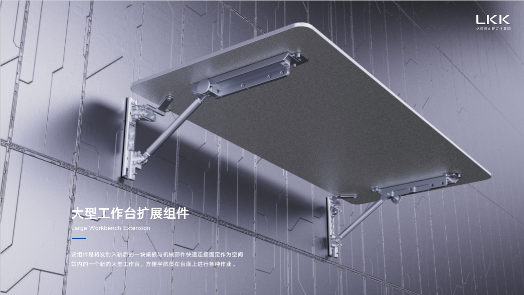 该大型工作台扩展组件是一组机械零件,发射入轨后的桌板可以和机械部件快速链接、固定,作为空间站内一个新的大型工作台,方便宇航员在台面上进行各种操作作业。