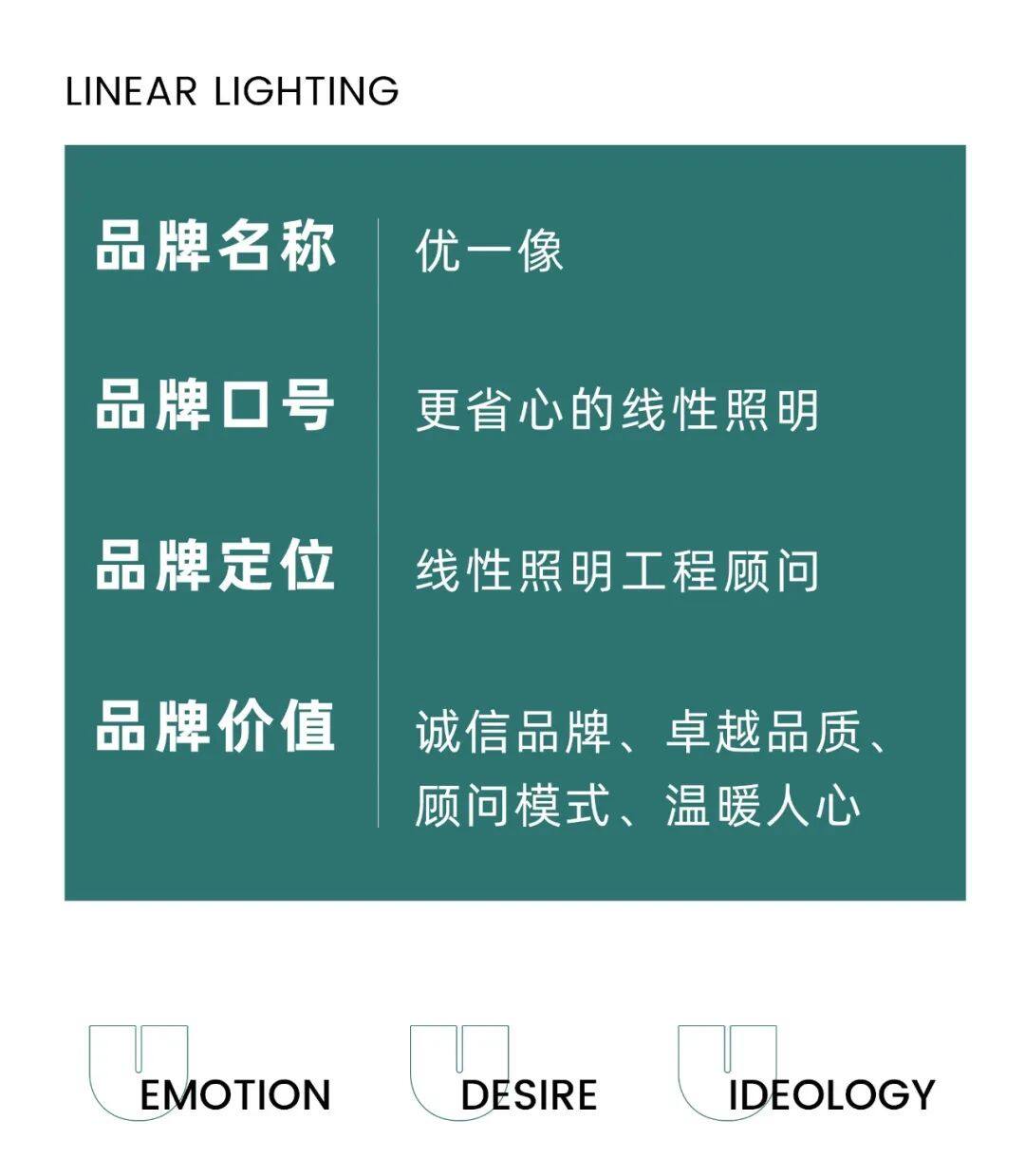 从构建品牌专业度出发,深圳蓝狮娱乐团队助力优一像提炼出“更省心的线性照明工程顾问”这一核心主张,从品牌战略层面对其进行全方位的品牌升级,以为消费者打造美好生活为愿景,对外传达输出“舒适、专业、品质”的品牌形象;