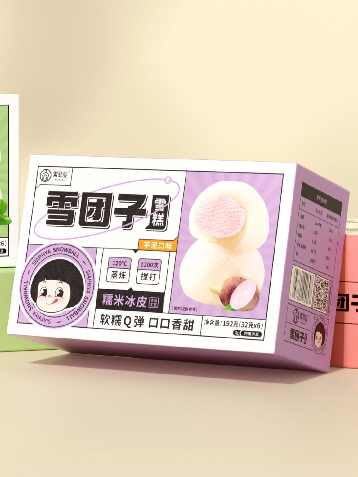 雪团子是索菲亚旗下的糯米冰皮雪糕,主打软糯Q弹的口感。设计师采用实物图片直观表达出产品的香甜美味,并且增加了萌趣的IP形象来体现软糯Q弹的感受。
