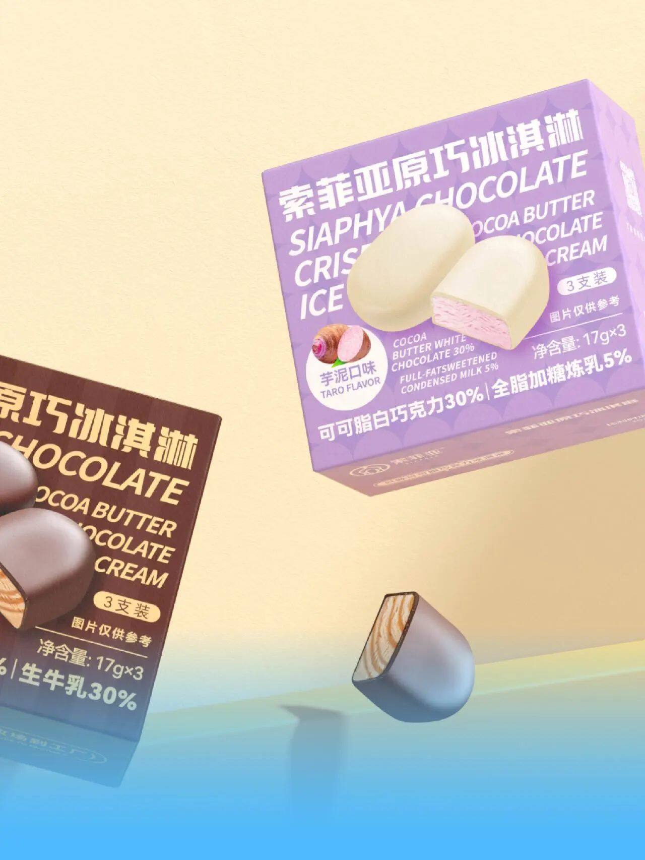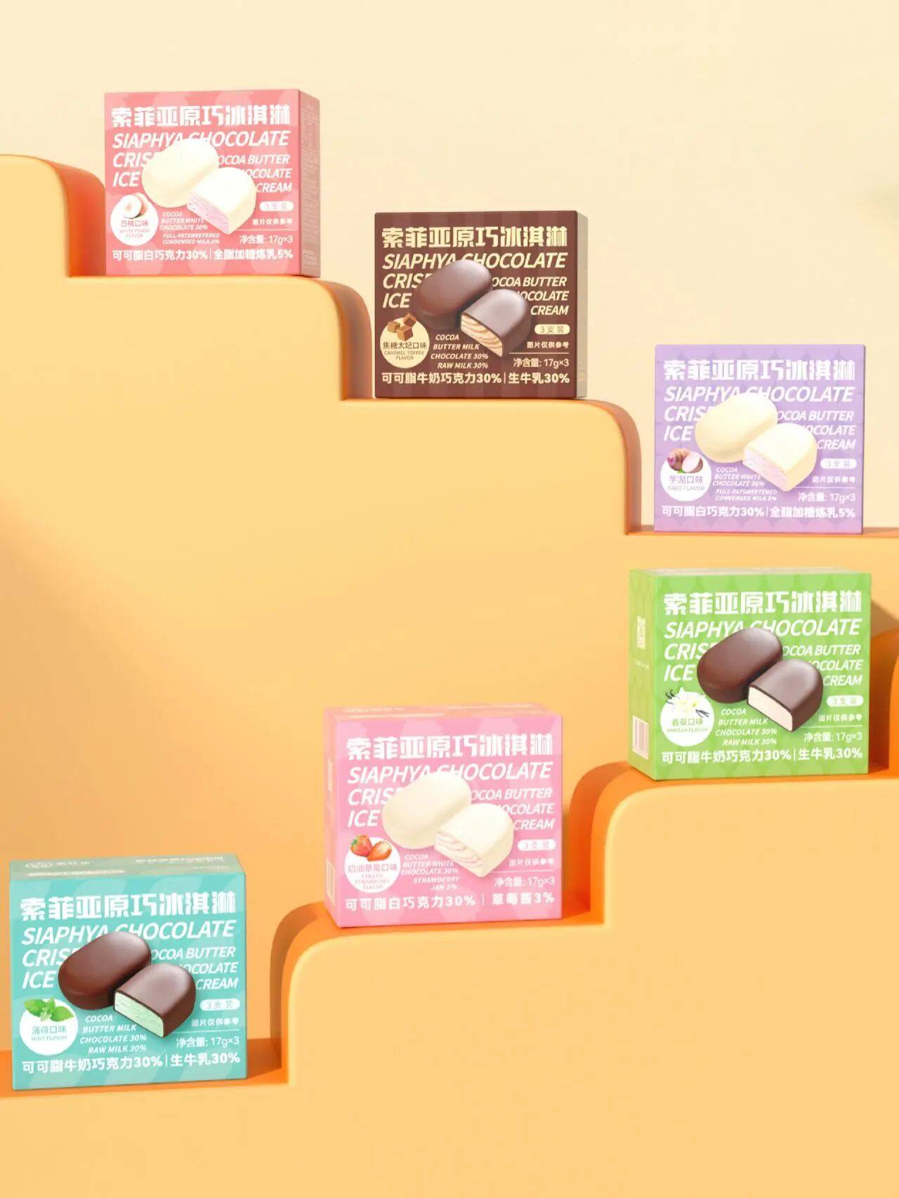 索菲亚原巧冰淇淋采用优质巧克力为原料,打造轻奢高端的雪糕产品。将优质的产品原料和卖点用平铺文字的方式进行呈现,结合产品实物图让包装简洁、高端又不失年轻感。
