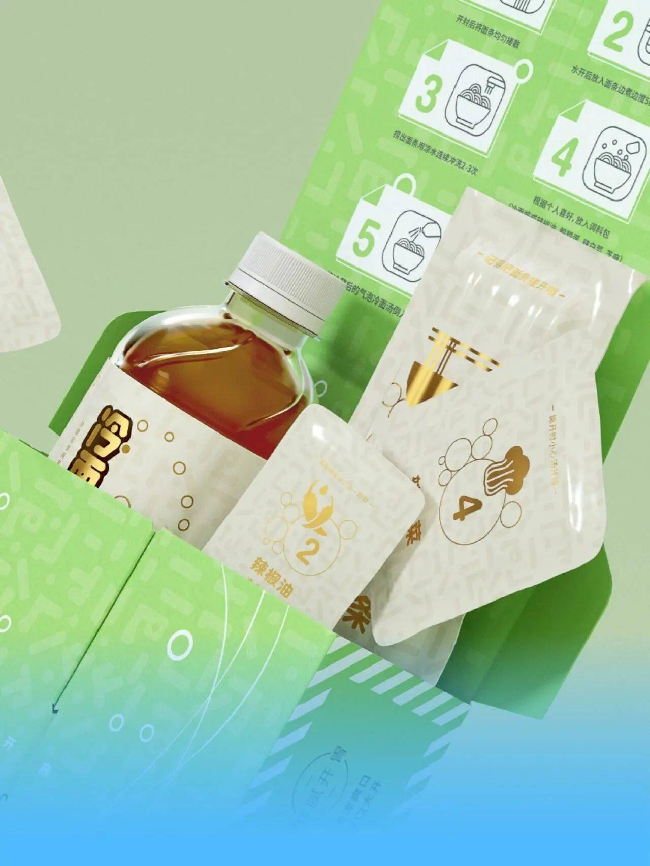 “气泡”是产品区别于竞品的重要特色,因此在字体、碗图、装饰图案上特别强化,让气泡的通透感肉眼可见。盒体色彩纯度高,从色彩上给人清爽的直接联想,加强品牌主题效果,让产品在货架上更容易被识别。