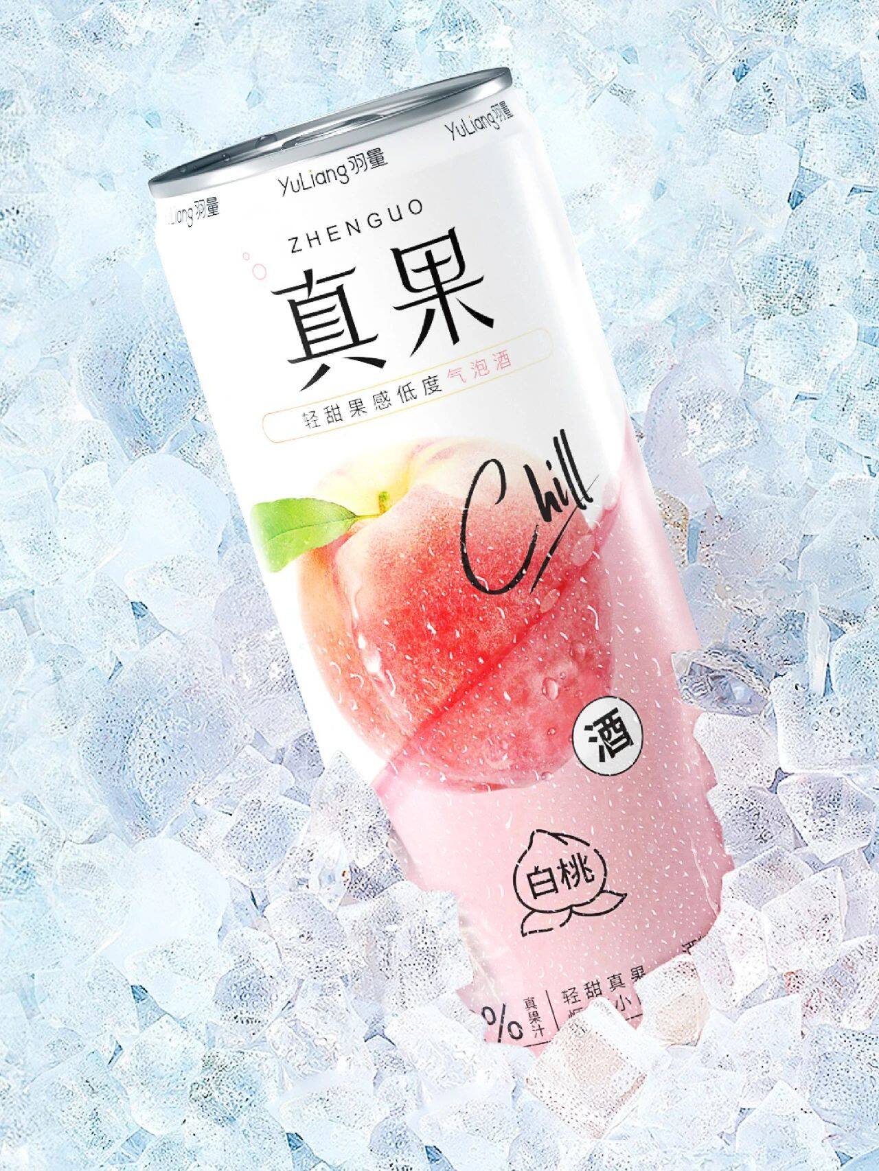 羽量真果气泡酒是专门为关注健康且有社交需求的年轻用户打造的低度酒饮,里面添加超过12%的纯果汁,能尝到真实水果的口感,设计表达上将新鲜水果一半浸在酒中,来体现自然水果的风味。