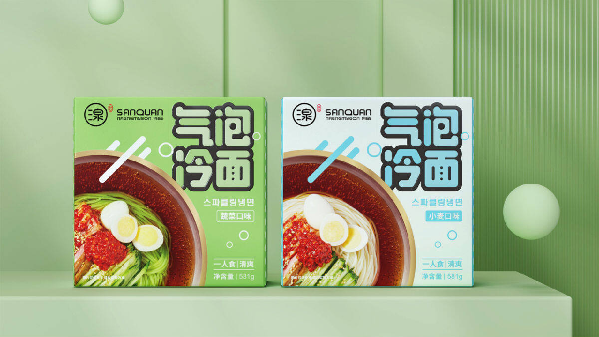 在与三泉冷面的餐饮品牌合作中,面对市场上的主流产品围绕“口味、价格”的激烈竞争,蓝狮娱乐团队从气泡水里找到灵感,汤面里面含气泡,带来更加清爽的感受成为了此产品撬动市场的机会点,帮助客户定义了“气泡冷面”的新品类,输出了“即享清爽”的产品价值。在设计语言的表达上强化品类名称,使其从各种销售渠道中被用户准确识别;碗图能够引起人的食欲感,碗边上的气泡也清晰可见;同时为了体现企业环保的理念,在外盒设计上不采用任何胶粘,用纸结构的方式就可以让产品好好地固定住。产品一经上市获得众多用户好评,成功地帮助客户打造了一个新品类,带来了超预期的商业价值转化。