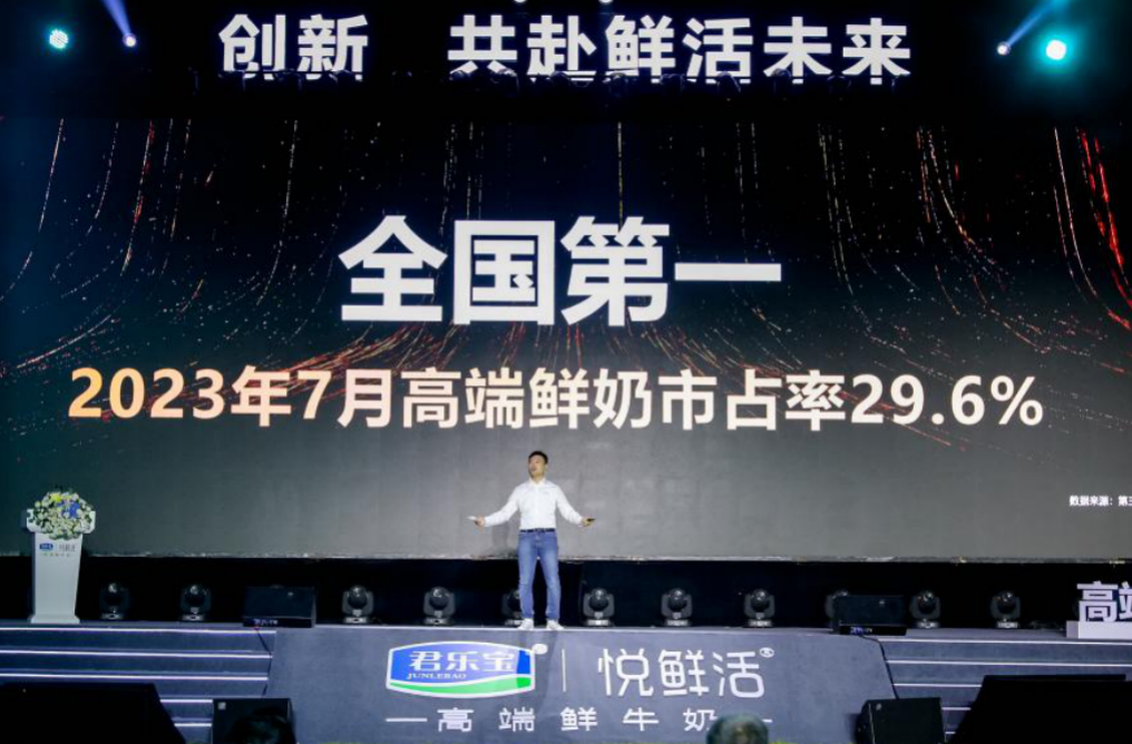 上月君乐宝召开发布会,公布了2023年7月悦鲜活在高端鲜奶品类的市场占有率提升至29.6%,问鼎全国第一,不到四年成为高端鲜奶第一品牌。
