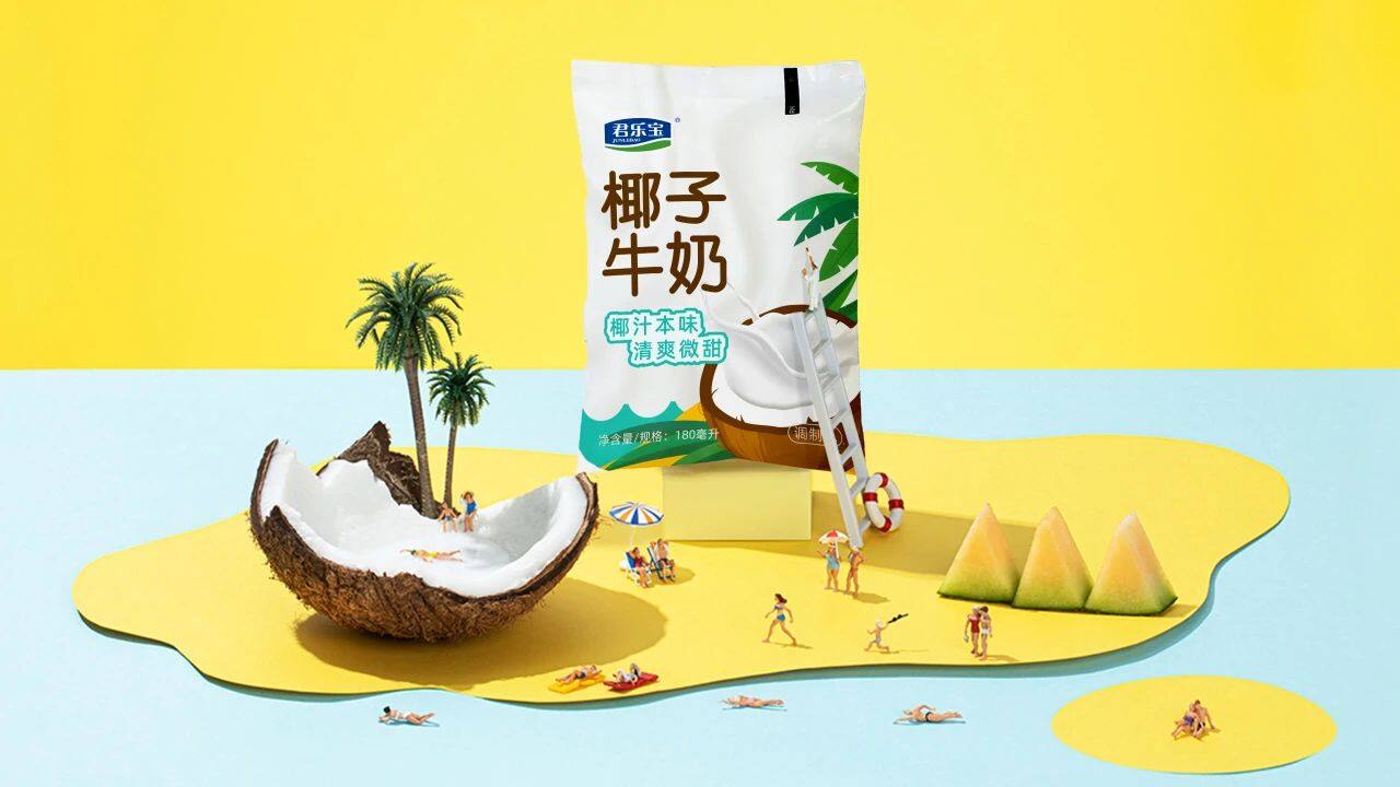 椰子牛奶的包装创意设计,则采用椰子加椰树的视觉创意组合来直观展现产品特点,给人清风拂面,椰林飘香的感受。