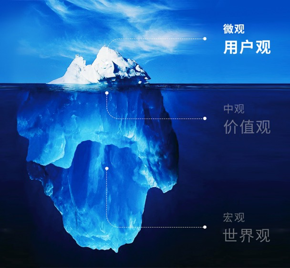 如果用一个冰山模型来作比喻,冰山水面以上的部分是用户观,求的是“真”——找到真用户,挖到真痛点,做真场景,才能打造真产品;中间部分是价值观,价值观是卖点,求卖点变价值;最底下一层是世界观。世界观因人而异,但存异求同。有世界观,有整体宏观层面的逻辑,你的产品就不会是一个小产品,才有可能改变世界。