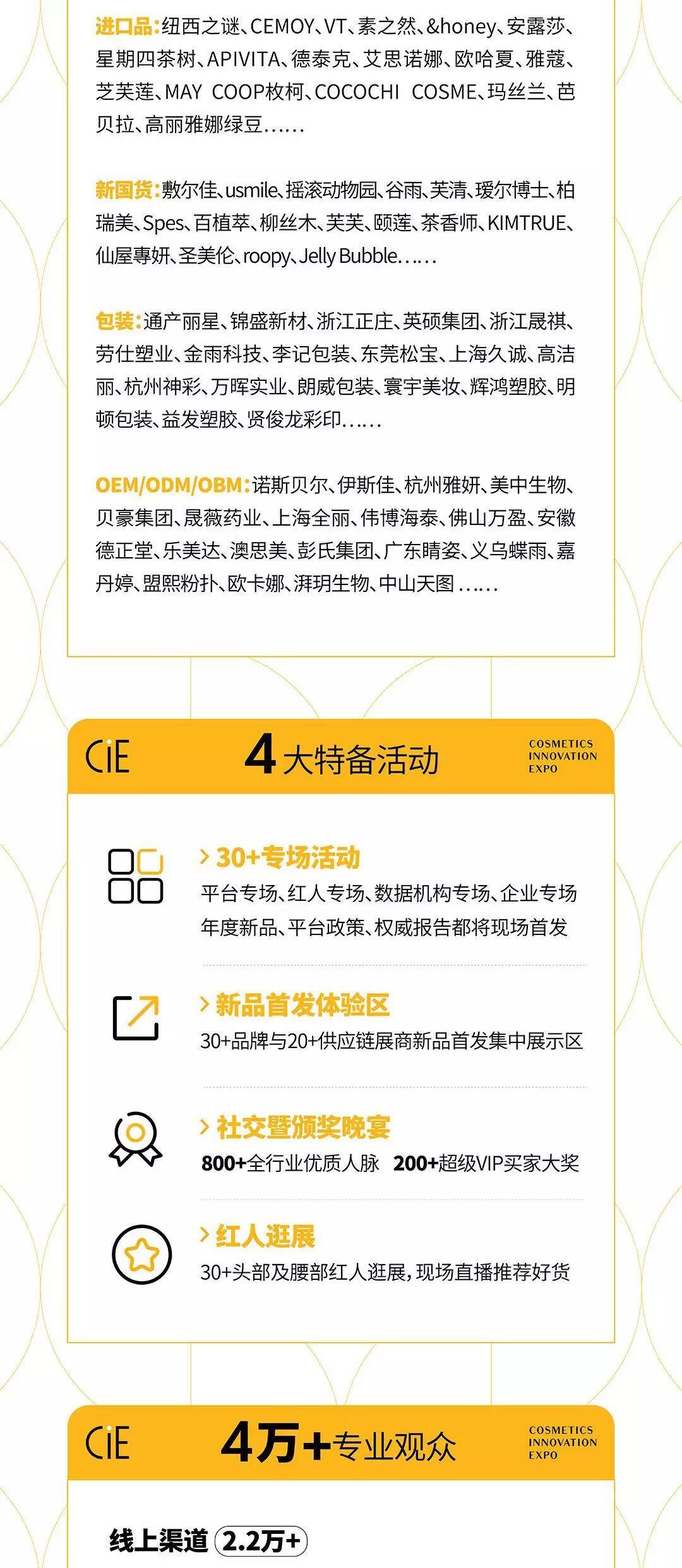 在2022CiE美妆创新展上,将有200+顶级美妆供应链企业参展,涵盖代工厂、包材商、原料商、检测机构等。